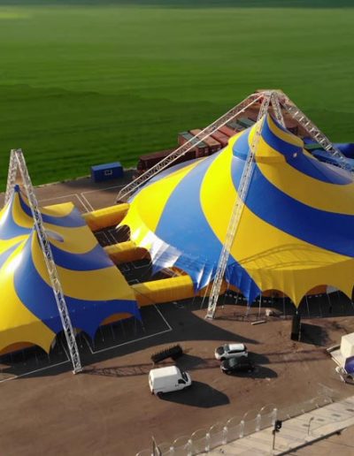 With a wide range of varying capacities it is possible to imagine virtually any event in one of our big top structures. Our mobile stadiums and big tops have full blackout capabilities for lighting and special effects, while the roofing structures can support full show light and sound rigs.
